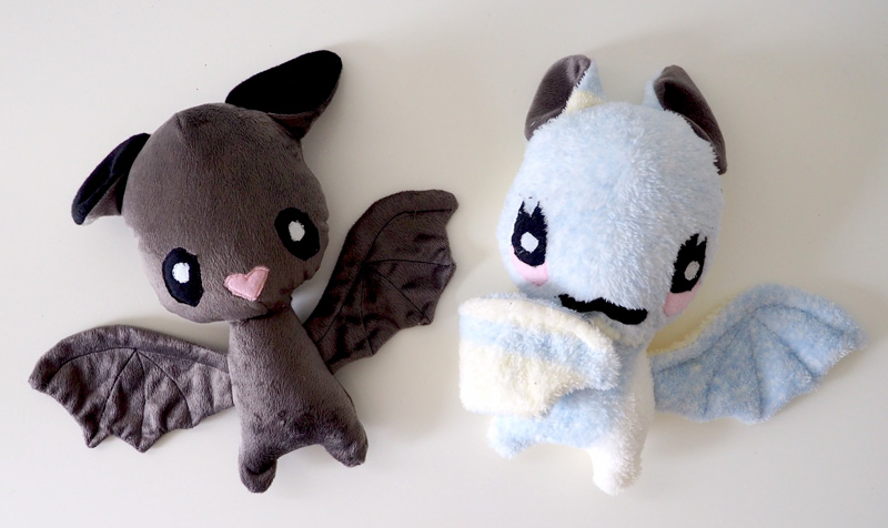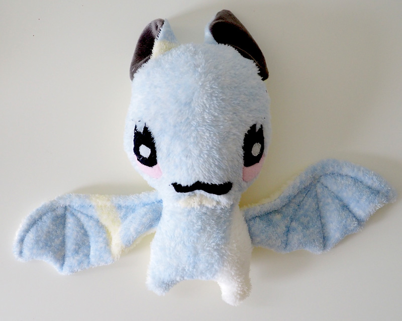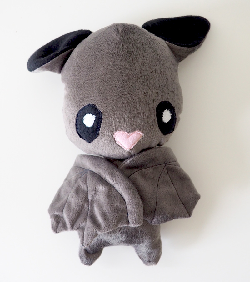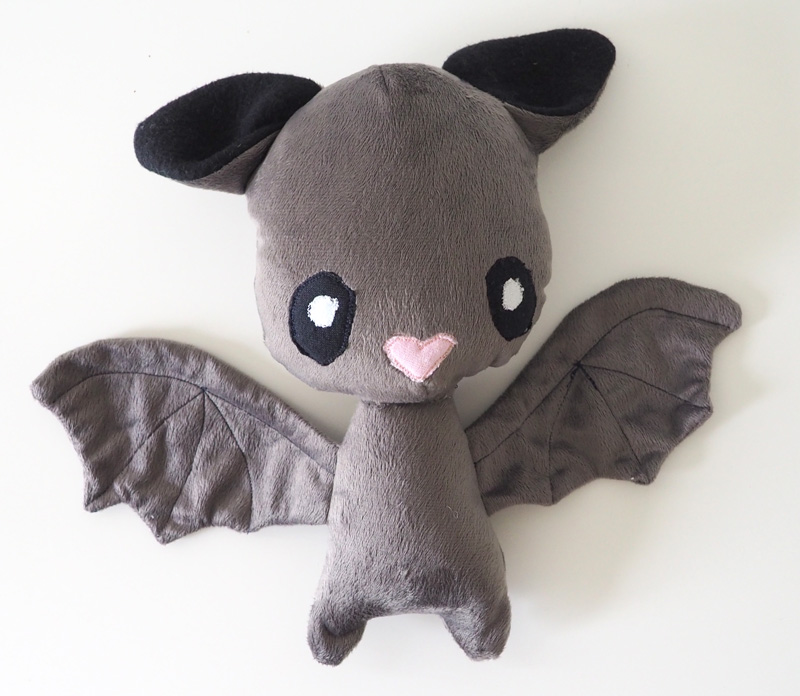 Pattern Description: Bat Plush toy with a big head, tiny body, and oversized wings and ears. It’s wonderfully floppy and expressive and very fun to hug. It features several face applique options including lashed eyes, heart shaped nose, fangs, and blush marks.