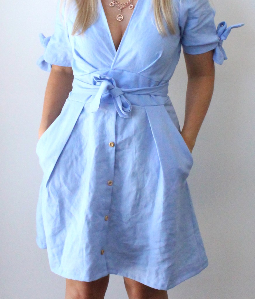 Description: The Sia Dress is a mini or midi length dress that comes lined or unlined. The dress features a low V neckline with a hook and eye for modesty, front bust pleats, back bodice darts, and a shaped waist band with optional self fabric ties.