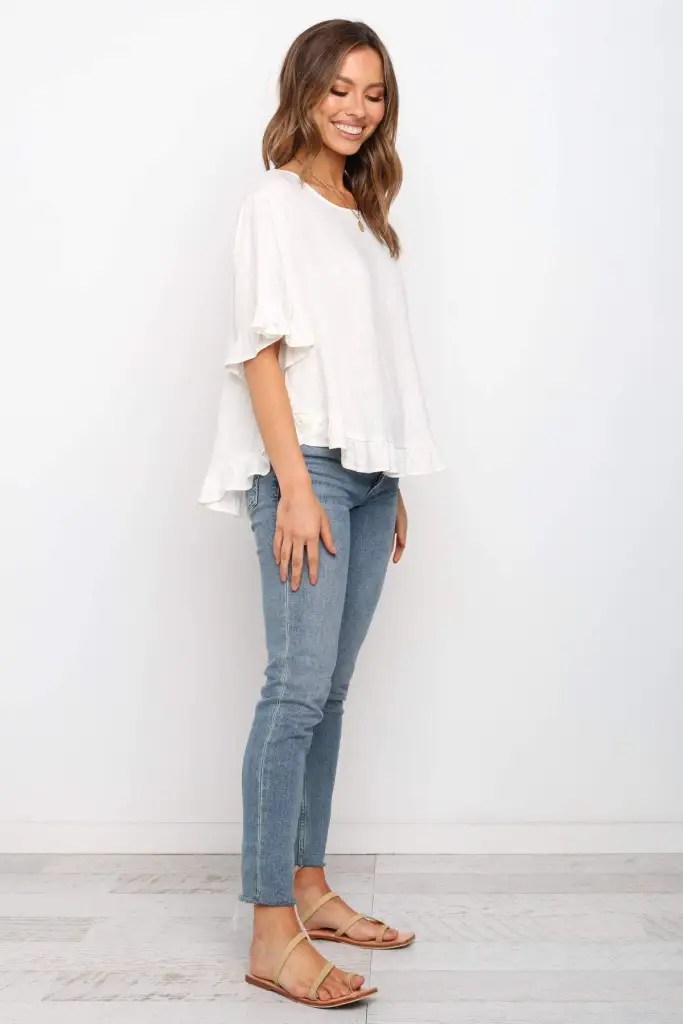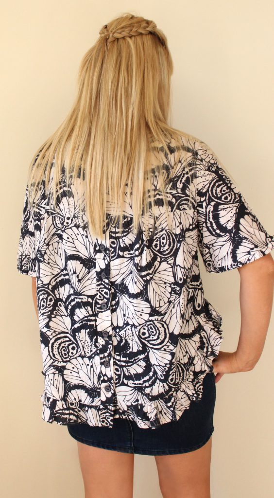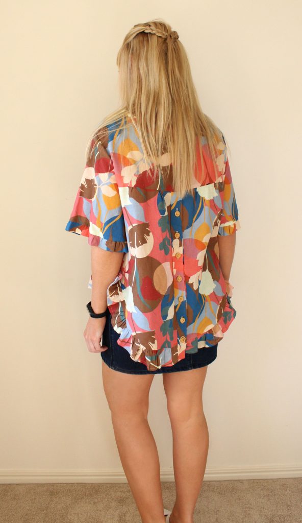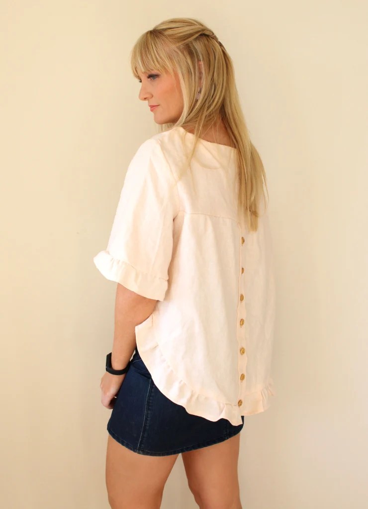 Description: Loose fitting blouse with frilled edges, button up back, longer curved back and a round neck line.