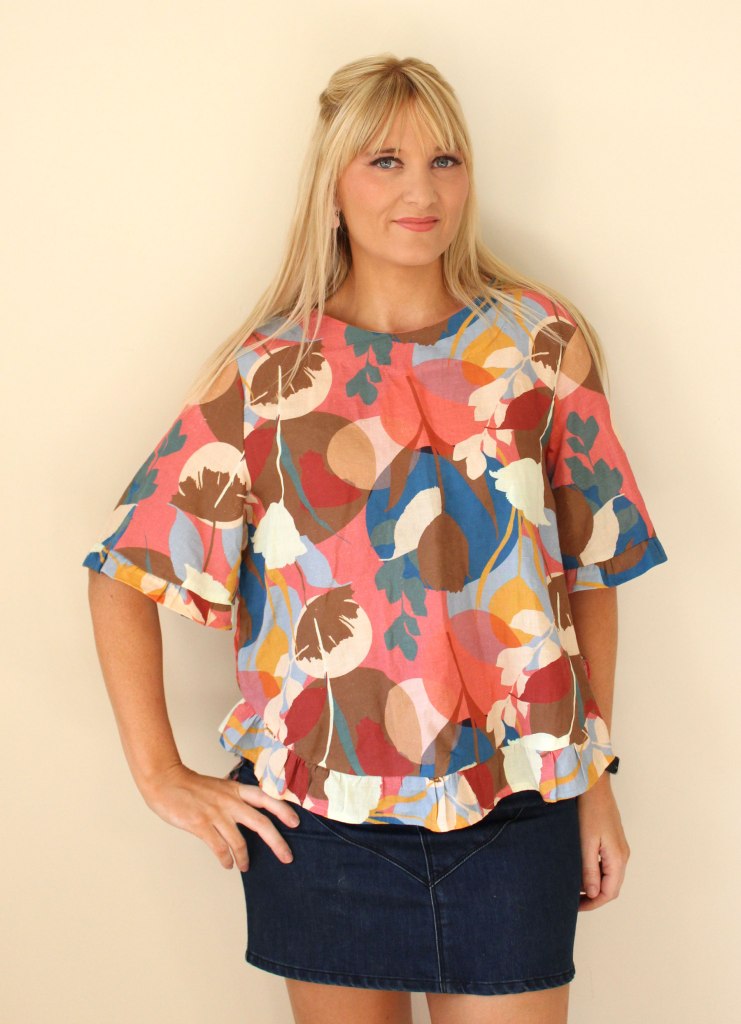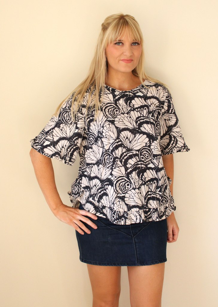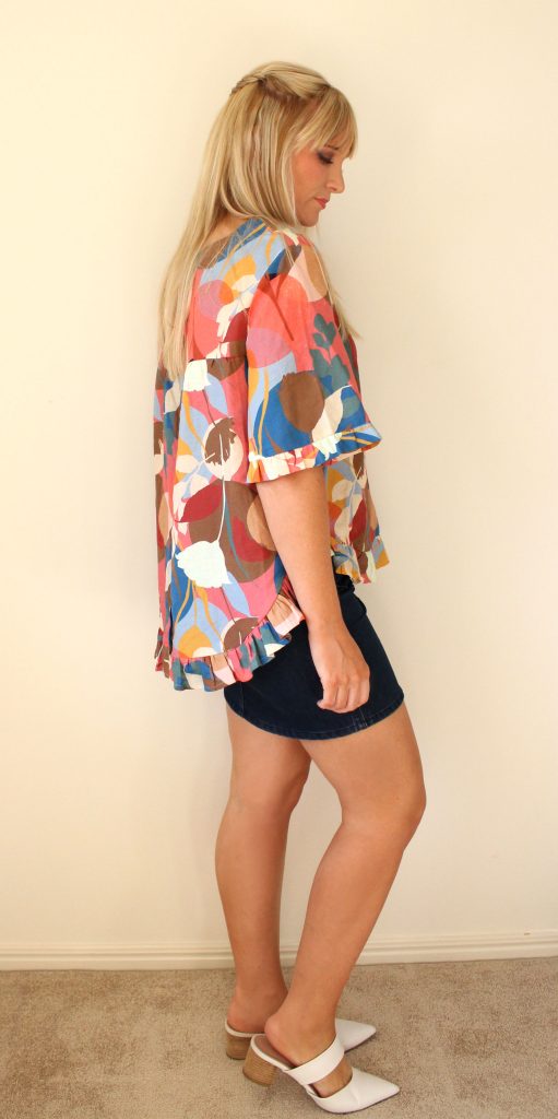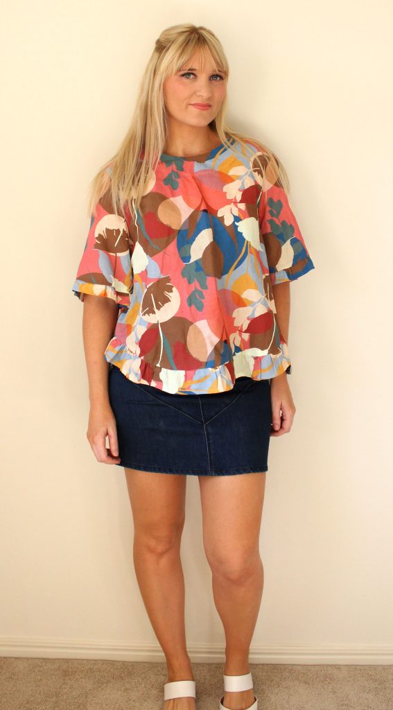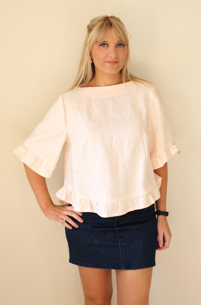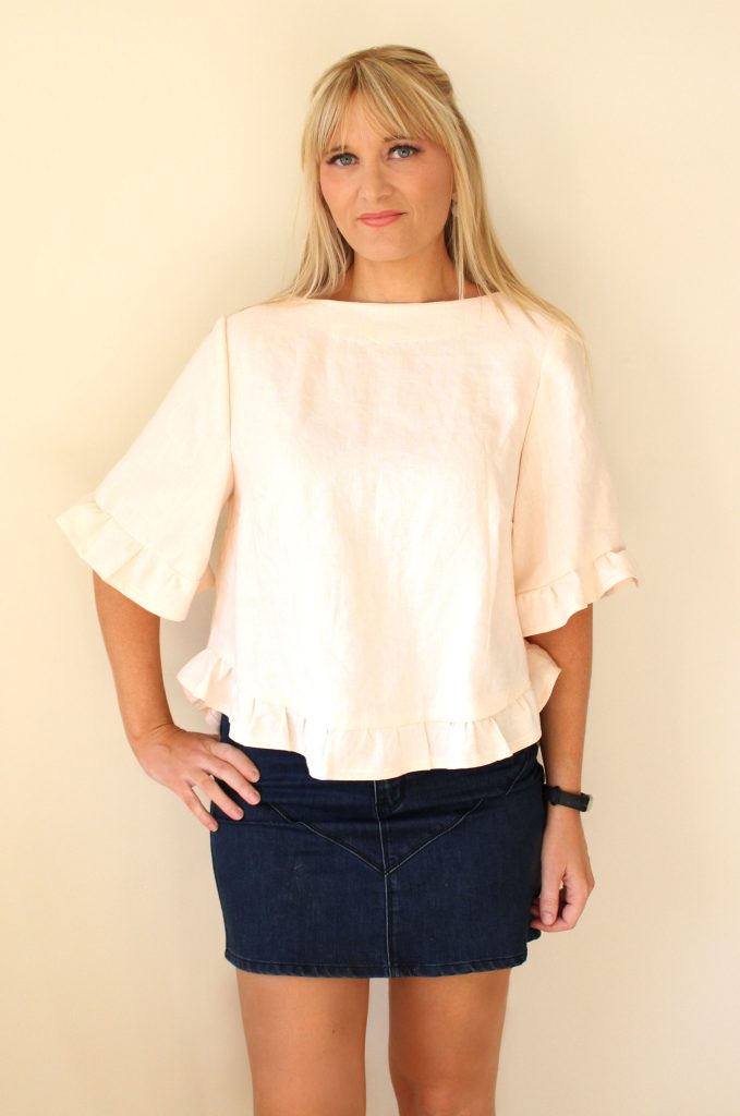 The edits that I made from the Tilly and the Button Blouse to make it more alike is to remove the front pleats and then cut out the top as one pattern piece. I curved the bottom of the blouse and made it longer at the back and shorter at the front. I then kept the sleeves as is but then added the ruffles around the edges and also along the bottom of the blouse.
