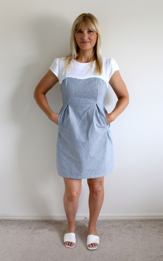 The main things that I love about this pattern is the two-toned layout (which you can mix and match with so many different fabric types – even sheer), front and back pleats, front pockets and cute capped sleeves. It’s such a flattering, cute style of dress, I just love wearing them!