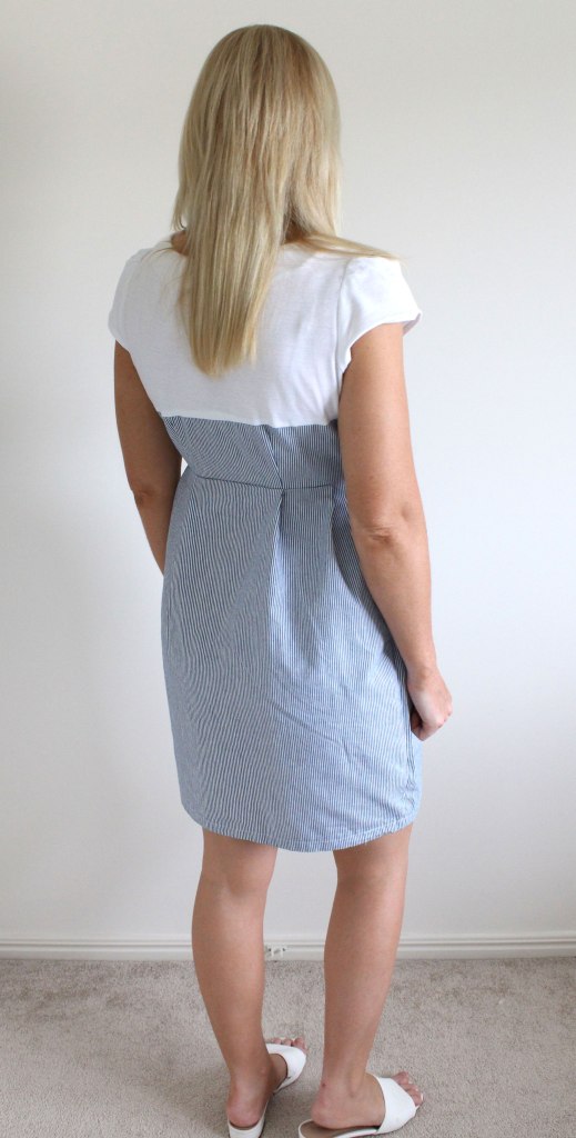 This is a close up where you can see the striped pattern of the dress and I absolutely just love this combination. As you can see I’ve copied this style for all of the Colette dresses that I’ve made. You can see these blog posts with my Colette Macaron Dress and the bright fabric version.