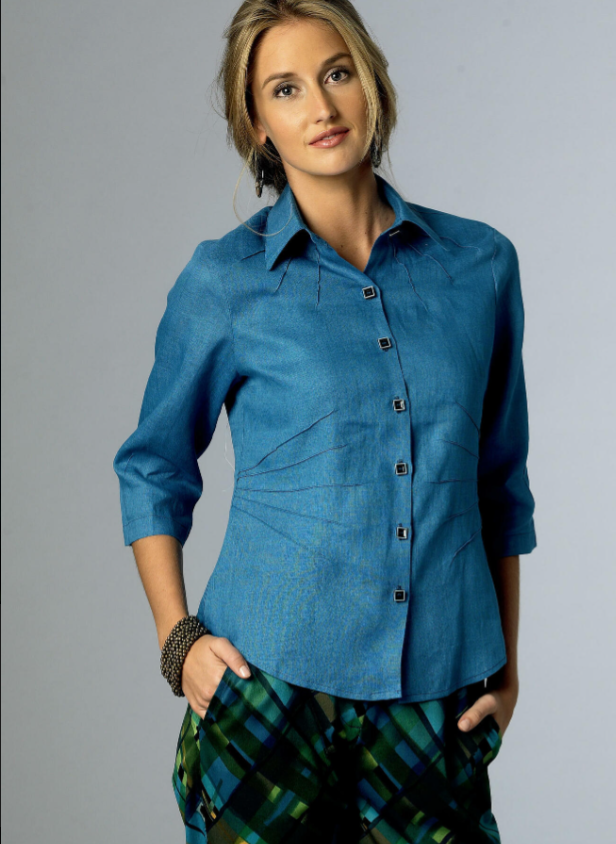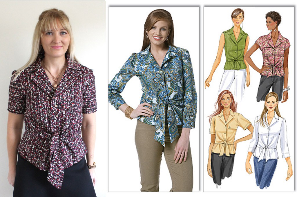 Pattern Description: Tie Front button up blouse with sleeve and pocket variations.
