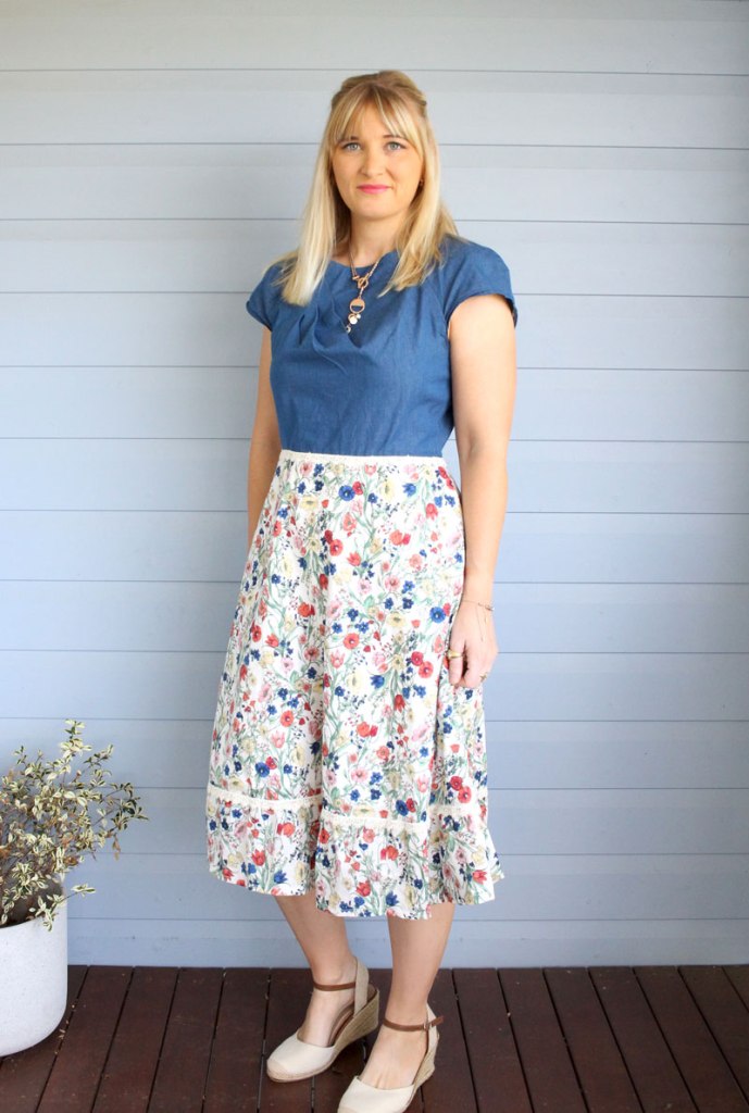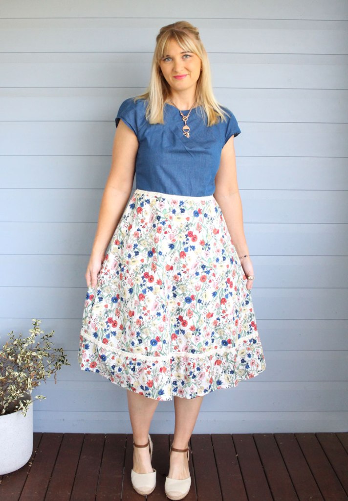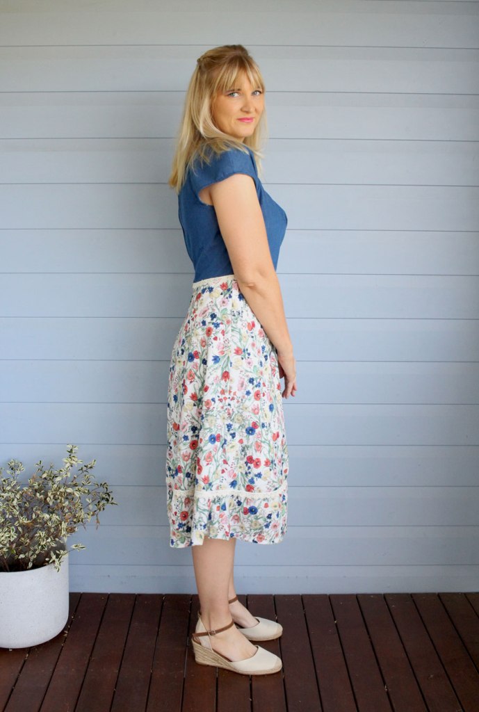 I’ve had this floral cotton fabric sitting in my stash for a few years now and really wanted to make something nice from it. However, I felt that a dress made completely in this fabric may have been too floral, so I opted for a denim style top and finished it with some lace.