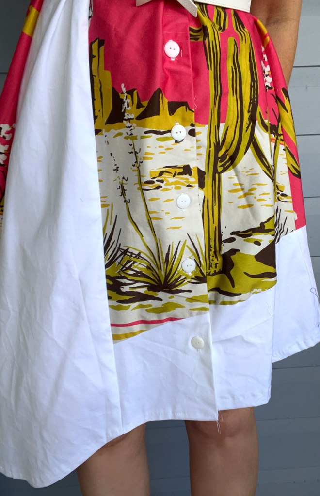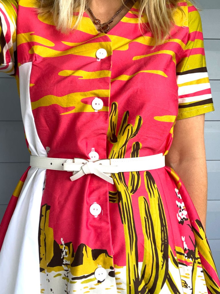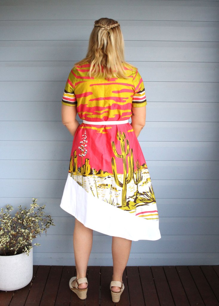 When trying to find a dress pattern for an upcoming sewing event I went through the Lekala Pattern catalogue and found some really beautiful dress patterns. This dress features a basic v neck, flounce style skirt and colour contrasting fabrics with a side panel. I thought this pattern would be perfect for this fabric I purchased from Spotlight being able to feature the majority of the desert cactus design.