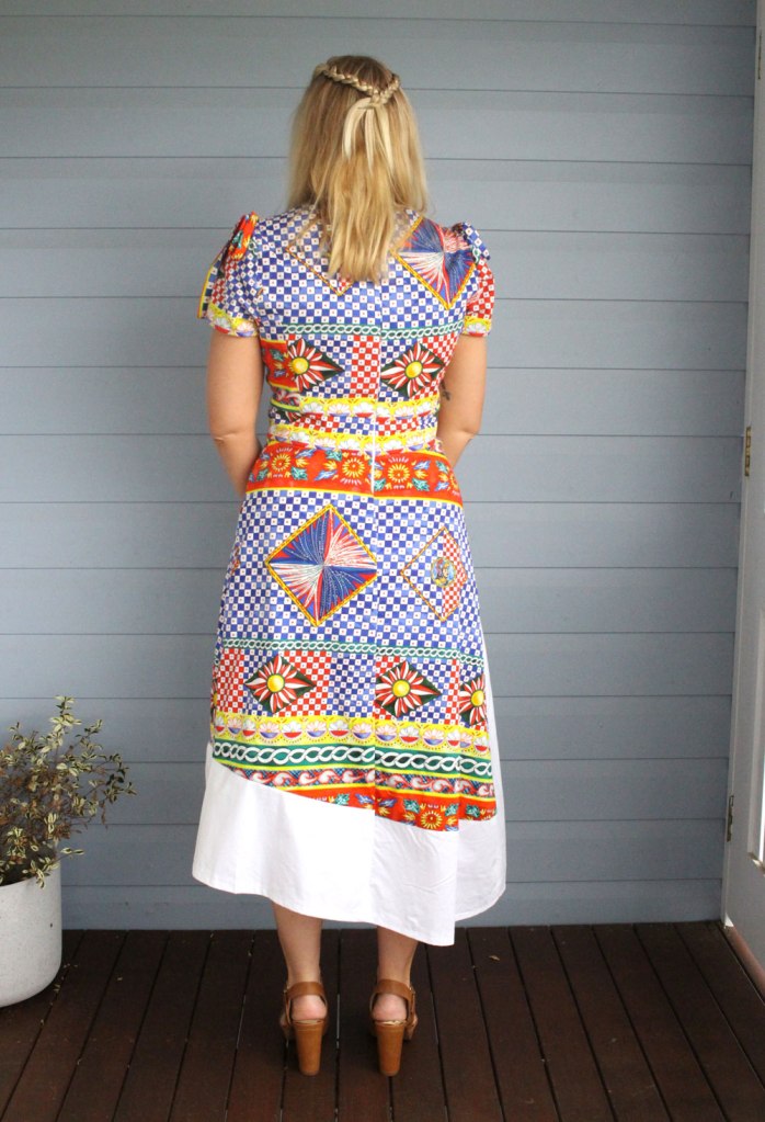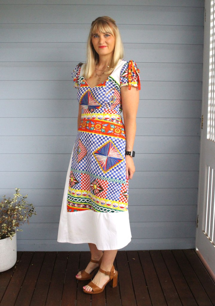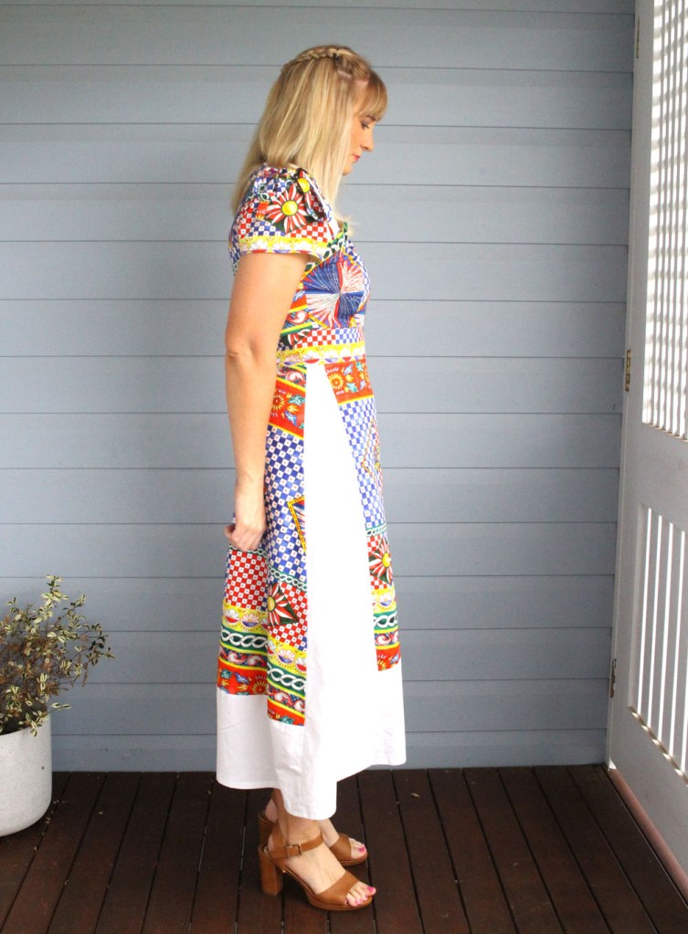 I wanted something that was going to be elegant, fun and bright, and also something I could wear again in summer. I originally created another version but really wanted something long and flowy, so I remade a new dress with a different skirt style. I also tested this dress with a more affordable denim fabric before I went cutting into this fabric given it was $149 per meter. I purchased two meters because I wasn’t quite sure how much I needed and only really used about 1.2 meters for this dress. So I was luckily able to create a colour block shirt out of it as well, which I can’t wait to finish.