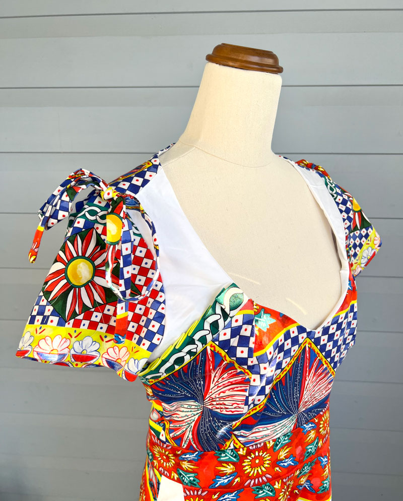 Pattern Description: This was a complete mash up of the two patterns. The skirt was an asymmetrical design with white cutout panel along the bottom. The top has a fitted sweetheart neckline with pleated side sections, cropped sleeves and sleeve bow ties.